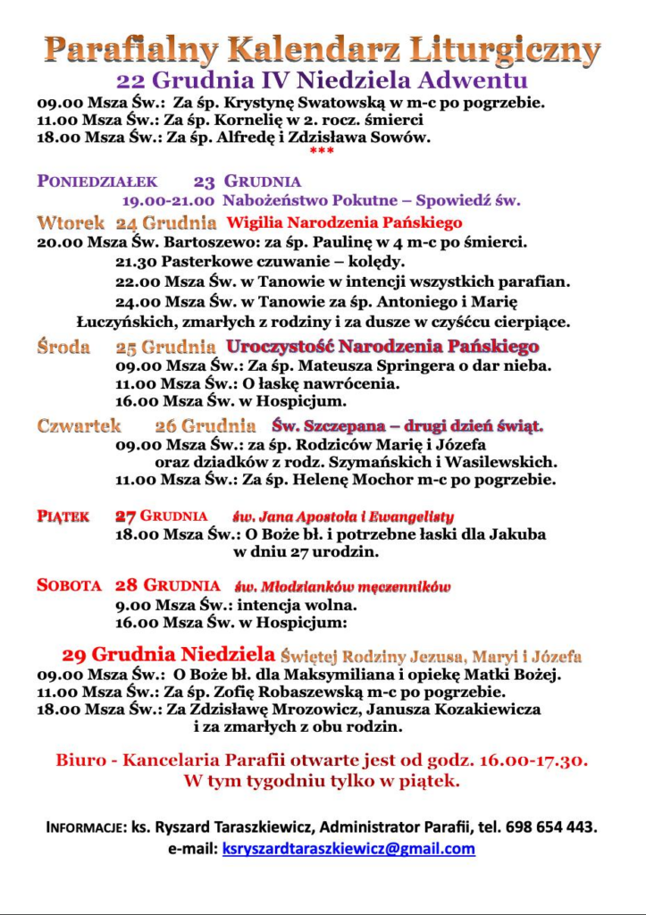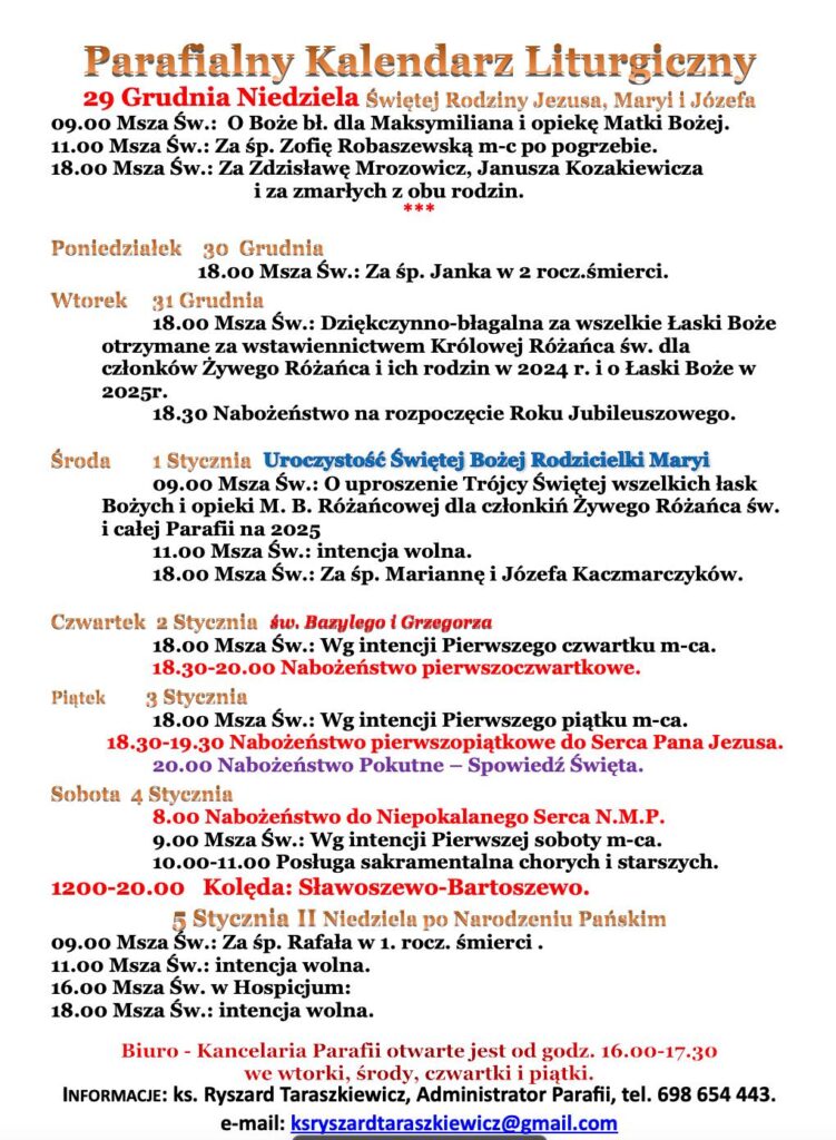 Informacje: ks. Ryszard Taraszkiewicz, Administrator Parafii, tel. 698 654 443.