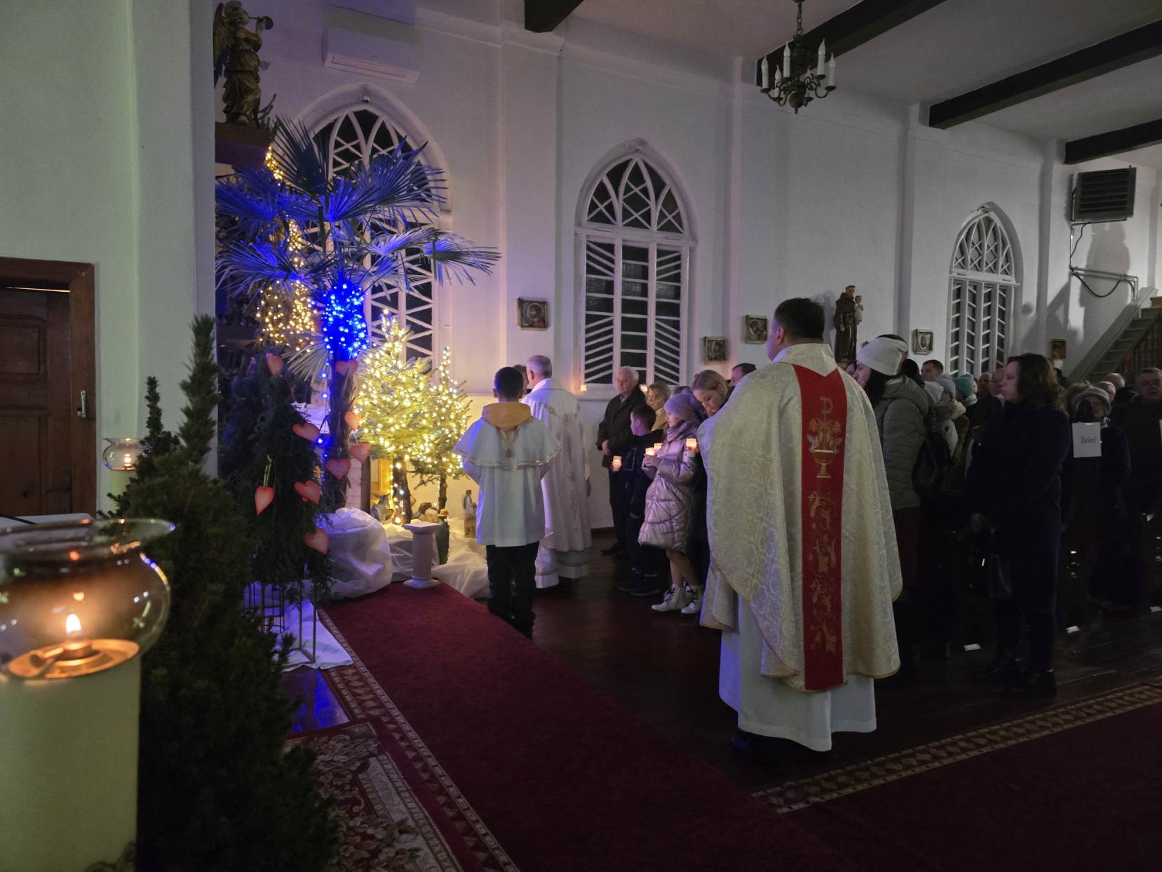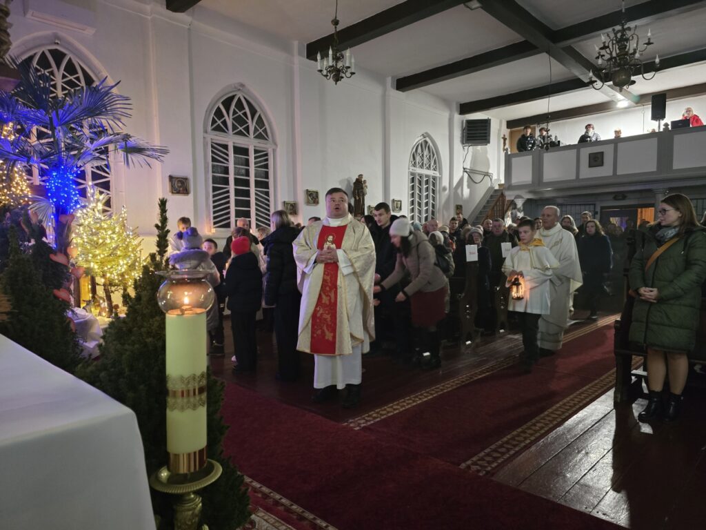 Pasterkę o godz. 22.00 rozpoczęło odczytanie Kalendy, tekstu umiejscawiającego Narodzenie Jezusa Chrystusa w historii, oraz uroczysta procesja wejścia, na czele której jedna z najmłodszych naszych Parafianek wniosła do szopki Dzieciątko Jezus.